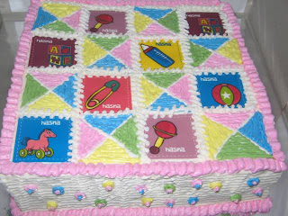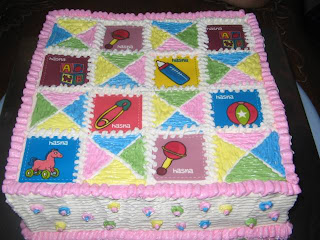 Waktu berkunjung ke salah satu blog favoritku, liat hiasan patchwork[baby hat box] mbak Peni.keren... dan temanya baby banget...jadi aku pengen nyoba bikin itu untuk birthday cake Hasna. Akhirnya aku pesan edible image ke Mbak Ina.